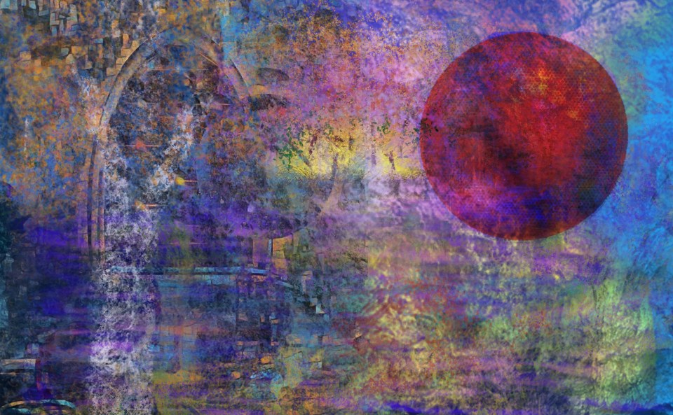 Our paintings, drawings, and collages are intended to demonstrate the complex ways in which space is pregnant with meaning. In our more representational work we do this by creating sacred landscapes and cityscapes which bring together elements which are themselves already heavily laden with meaning, such as sanctuaries or markets, in ways which are surprising and thus force the question of meaning. A forest clearing with a church or a city with buildings from diverse historical contexts and periods is not, first and foremost, an absolute space through which physical objects move over time, or even a relativistic space created by the presence of mass, but rather an axiological space constituted by the meanings which order it. Our more abstract work does the same thing through the use of minimalistic traces of symbols or objects with meaning, and through the use of color and value, which themselves carry definite meanings and convey definite moods.